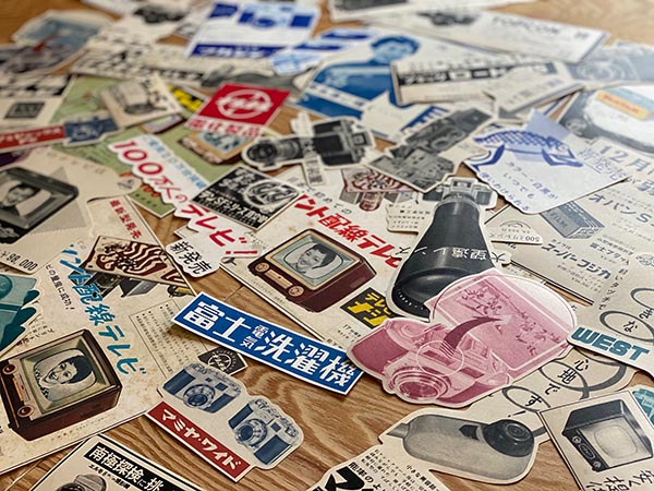 1920~60年代当時の実物の企業広告、雑誌掲載物で作った手作り1点ものシール4000枚と広告ポスター1500枚をバイキング販売します。