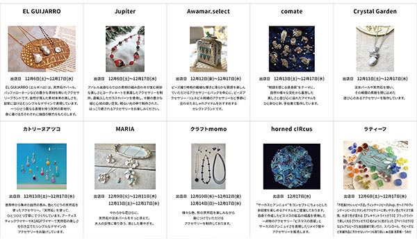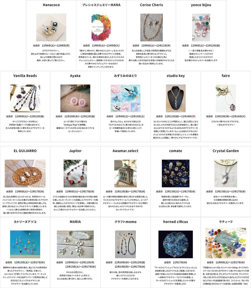 10F 12月6日(土)~17日(水) ジュエルギルド ビーズや天然石を使ったハンドメイド作家が入れ替わりで出店。 不思議かわいいビーズ店「ラティーフ」のビーズパーツも販売いたします。 ■開催場所:名古屋店10F イベントスペース ■開催期間:12月6日(土)~17日(水) 参加作家
