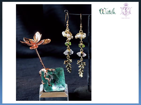鉱物と銅化した本物の植物を使ったアクセサリー『Witch』と、オブジェ『花石kaseki』を展示販売します。